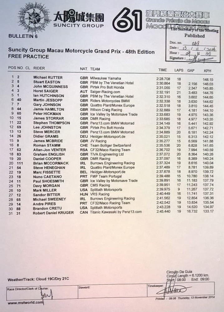 Ad oltre 2 secondi dalla vetta troviamo Stuart Easton: il piccolo scozzese, vincitore al Guia nel 2008, 2009 e 2010, rientra in Cina dopo qualche anno e lo fa in modo finora egregio. Il suo compagno di squadra in PBM Kawasaki, il vincitore della scorsa edizione del Macau GP Ian Hutchinson, si trova in quinta posizione. Terzo posto per un altro esperto del Guia, John McGuinness, in sella alla Honda Pirtek Pro-Bolt (RAF Reserves), che porta un bella dedica a Simon Andrews sul serbatoio.