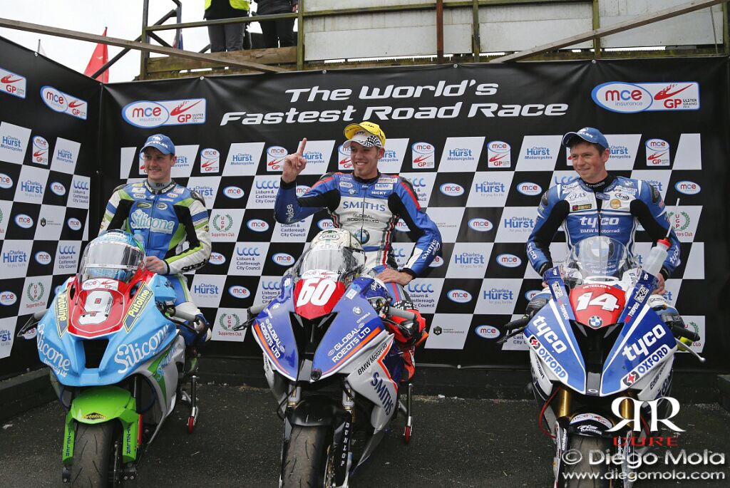 Velocissima pausa e poi tutti in griglia per la seconda gara Supersport, interrotta però con red flag al primo passaggio per la caduta di due piloti all’Hairpin. La griglia, piuttosto decimata con molti riders che decidono di riposarsi per la “main race”, si riforma dopo circa 15 minuti per un’altra gara letteralmente da brividi: al via è Hickman a comandare, seguito da un redivivo Michael Dunlop sulla bella Yamaha Carl Cox MD Racing, poi i compagni su Honda Padgett’s Lee Johnston e Bruce Anstey, James Cowton su Kawasaki McAdoo. Al termine del primo passaggio si ritira William Dunlop, dolorante per lo scafoide rotto dieci giorni fa. Tutto fa presagire, finalmente, l’attesa bagarre tra Hickman e Michael Dunlop, ma non sarà così. Questo è l’Ulster GP di Hickman e Anstey, con il “kiwi” che passa prima Lee Johnston e poi “MD”. Al quinto passaggio Anstey sferra l’attacco anche su Hickman ed è primo lungo il velocissimo Flying Kilo; Hickman risponde alla destrorsa di Wheeler’s, mentre Johnston si prende la terza piazza ai danni di Dunlop, preparandosi al giro della vita: Lee attacca anche Anstey a Deer’s Leap, poi Hickman, e tra il tripudio generale comanda questa gara Supersport. Ma né Hickman né Anstey si fanno intimidire e risucchiano il piccolo “generale Lee”: negli annali dell’Ulster Grand Prix rimarrà il sorpasso di Peter Hickman su Lee Johnston in staccata a Wheeler’s, forse “ai limiti dell’accettabile nelle road races”. Ma è fatta. Peter Hickman si avvia verso la sua terza vittoria di giornata, tagliando il traguardo per primo con la particolarissima Triumph Trooper Beer; alle sue spalle Bruce Anstey e poi Lee Johnston, che perde la posizione anche sul “kiwi” proprio a causa del sorpasso di Hickman. Seguono Michael Dunlop, un ottimo Paul Jordan, Jamie Coward, Chris Elkin, Dan Cooper, James Cowton e Joey Thompson.