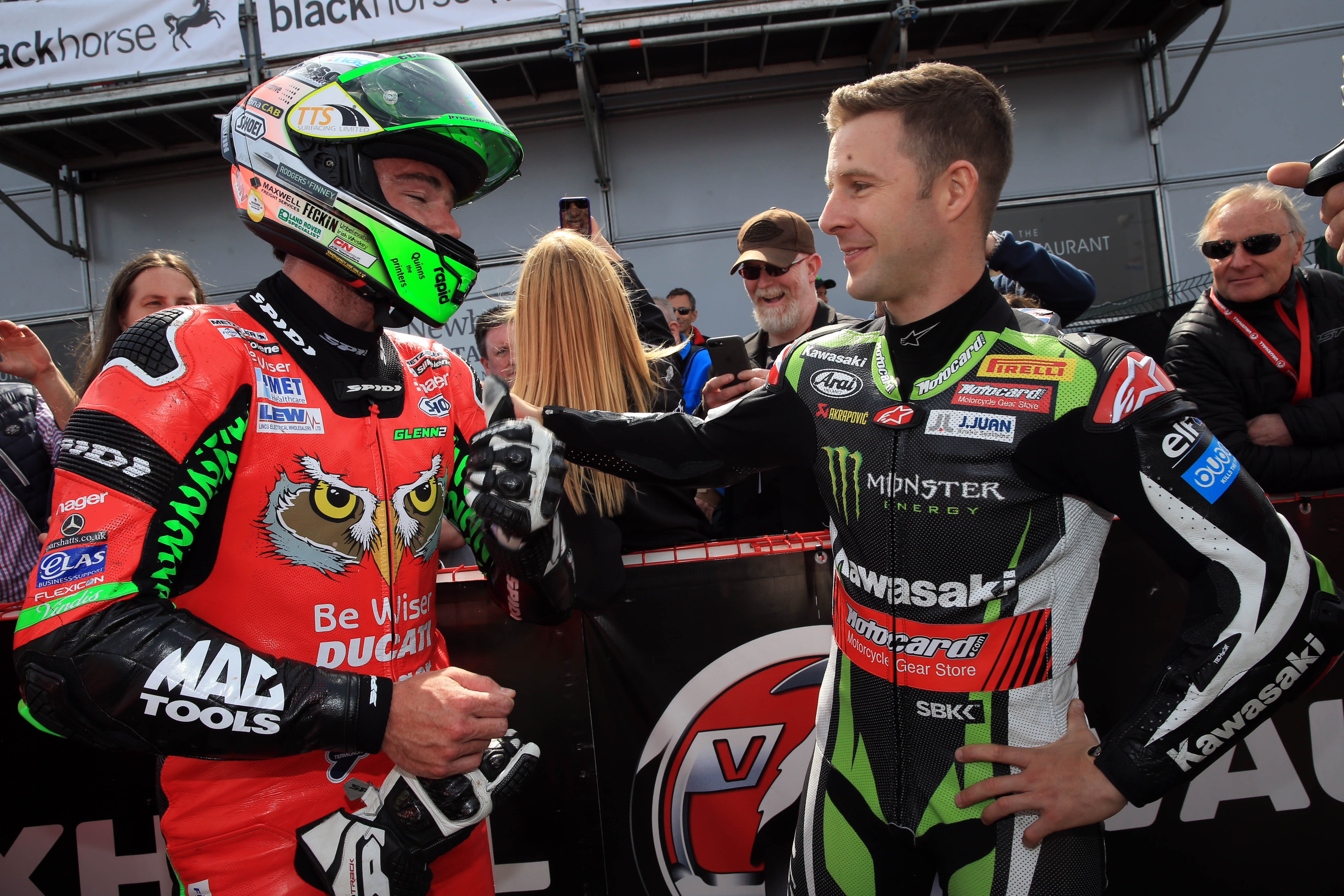 Jonathan Rea si congratula con Glenn Irwin dopo la vittoria della SBK Race alla North West 200 2018 (foto: Stephen Davison)