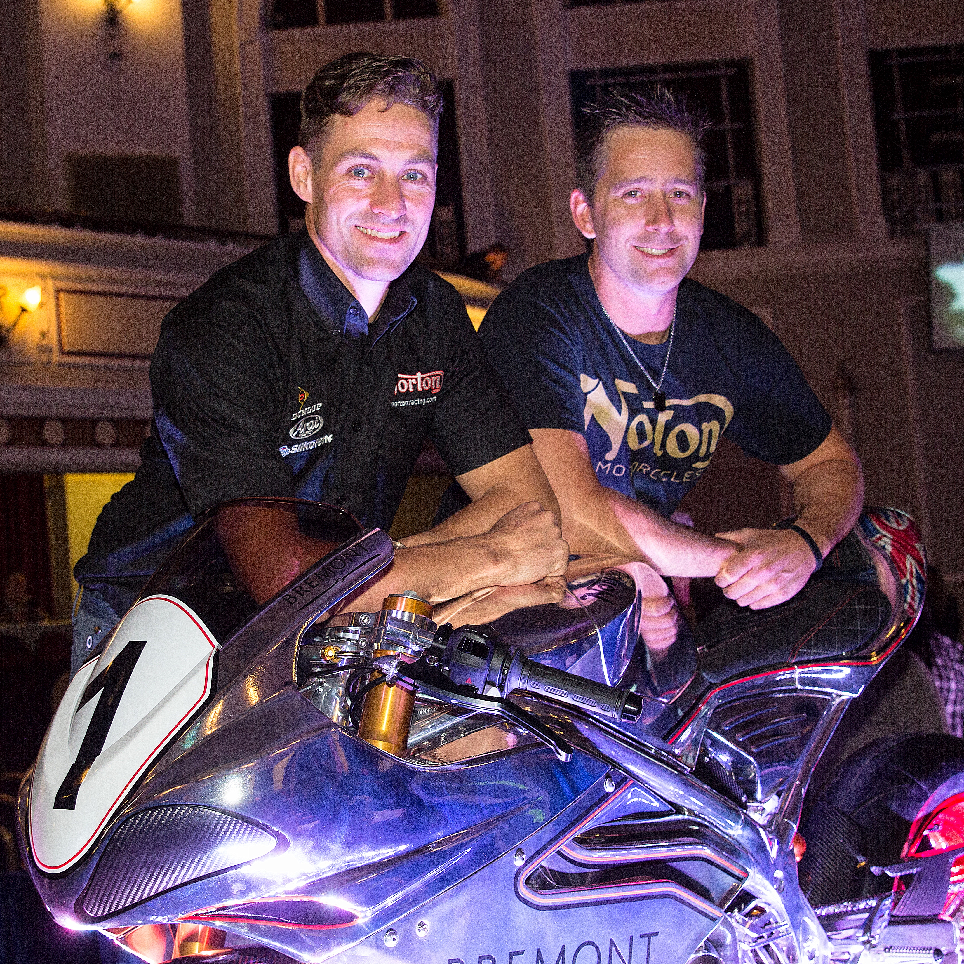 La bellissima Norton esposta al TT Launch di Villa Marina con i due piloti australiani Joshua Brookes (sinistra) e Davo Johnson (destra). Foto: Mark Falconer