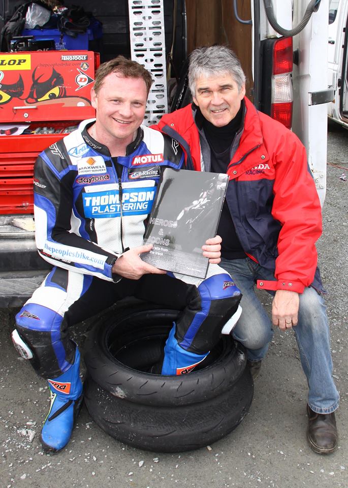 Stephen Thompson, in tuta, riceve da Paul McClean il libro “Heroes & Icons portraits from the track”.