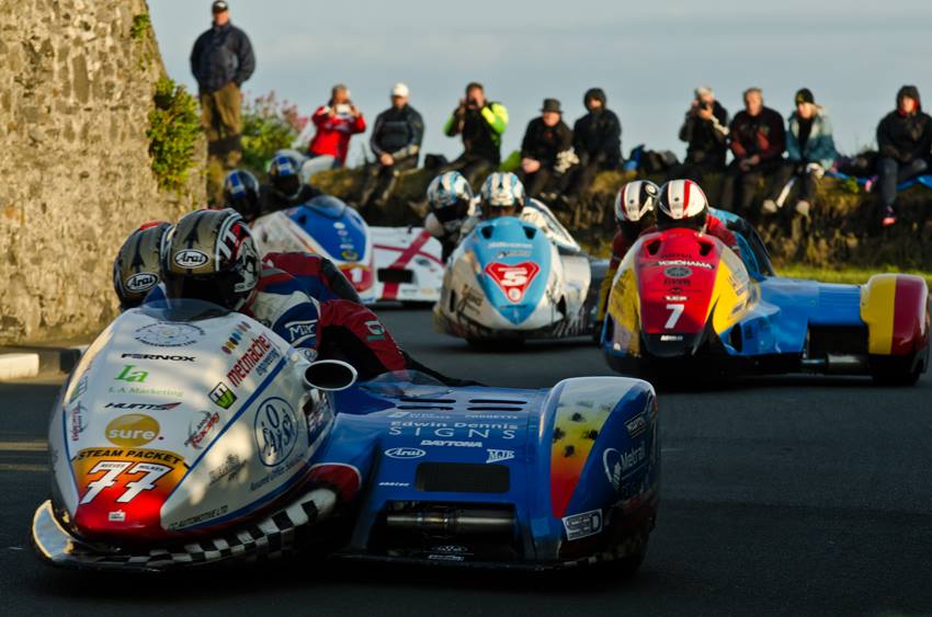Penultima gara di giornata è la “Manx Gas Sidecar Championship”, che vede nuovamente protagonisti gli equipaggi Reeves/Wilkes, Holden/Sayle e Bell/Bell. Sulla distanza di 8 giri è Tim Reeves con il passeggero Mark Wilkes a cogliere la doppietta in questa edizione della Southern 100, una grande soddisfazione macchiata però da un’amara polemica con l’ex sidecarista Nick Crowe. Secondo posto ad oltre 2 secondi per John Holden e Dan Sayle, quest’ultimo impegnato anche nella gara delle 125cc. Terzo gradino del podio per il bel sidecar rosso blu e giallo di padre e figlio Ian e Carl Bell. Reeves e Wilkes fanno anche segnare il nuovo record del tracciato per le 3 ruote con un passaggio in 99.740 mph.