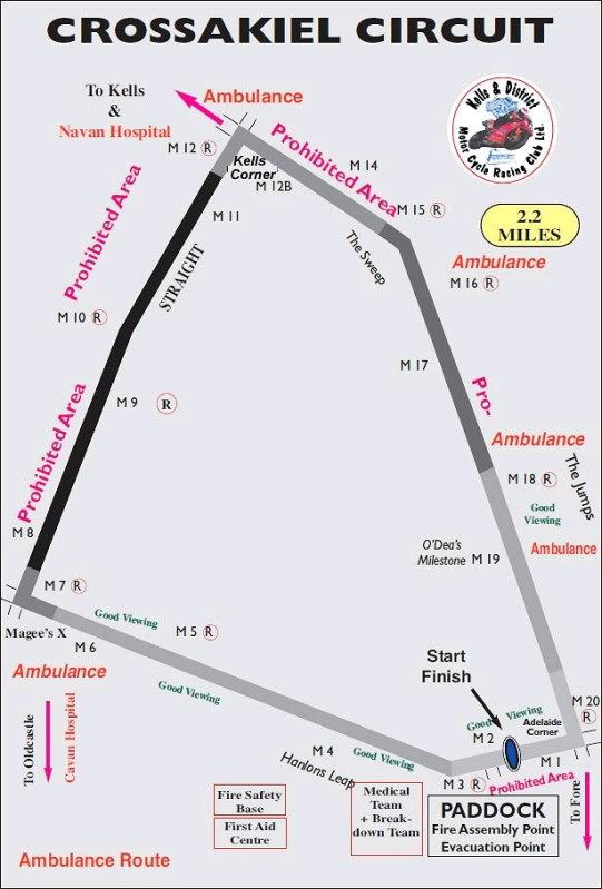 Il Crossakiel Circuit di Kells è uno stradale di circa 2,2 miglia, di forma quasi triangolare, ricco di saliscendi e immancabili salti tipicamente road racing (in foto,